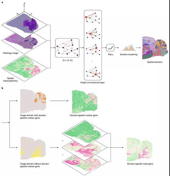 SpaGCN首先建立了一个图来表示所有点之间的空间位置和组织学信息的关系。接下来,SpaGCN利用一个图卷积层来聚合相邻点的基因表达信息。然后使用聚合表达式矩阵对点进行无监督迭代聚类。每个聚类都被认为是一个空间域,然后SpaGCN通过DE分析检测在一个域中富集的空间可变基因(SVG)。