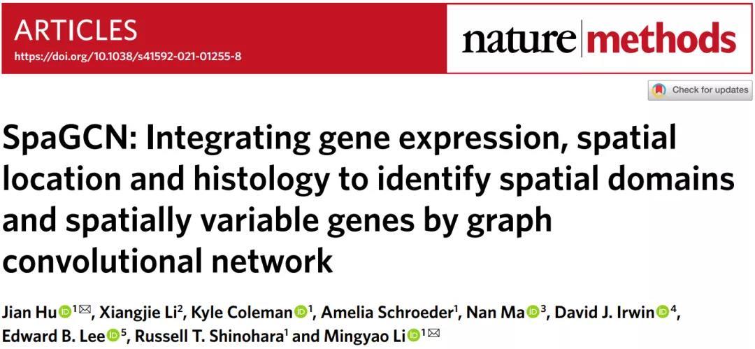 介绍宾西法尼亚大学的Mingyao Li老师发表在Nature methods的一篇论文“SpaGCN: Integrating gene expression, spatial location and histology to identify spatial domains and spatially variable genes by graph convolutional network”。本文提出了一种基于GCN的方法来同时考虑空间域和空间可变基因(SVG)识别两个问题。SpaGCN 首先通过构建表示数据空间依赖性的无向加权图来整合基因表达、空间位置和组织学来识别空间域,之后对于每个空间域检测域中丰富的SVG。