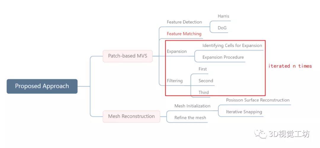 该论文提出的方法可以分解为三个主要的部分:1. 重建出若干可以完整覆盖目标物体/场景的面片;2. 将面片模型转换为多边形渔网模型;3. 优化多边形渔网模型。这里重点分析文中提出的“匹配-扩张-剔除”策略,这也是PMVS算法的核心内容。