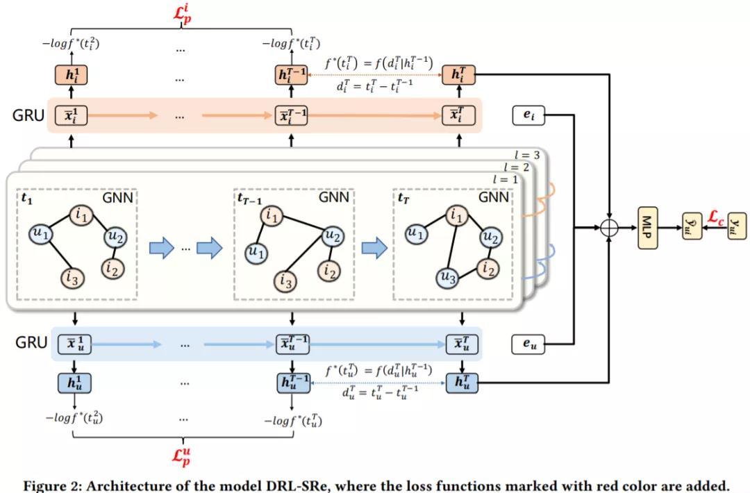 如图所示为所提方法DRL-SRe的整体框架图,时间切片的图神经网络用于从序列数据中学习user和item的表征。将从时间序列中得到的表征和静态表征结合后用于预测。