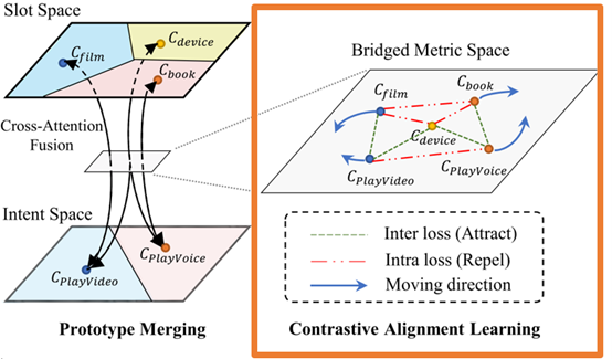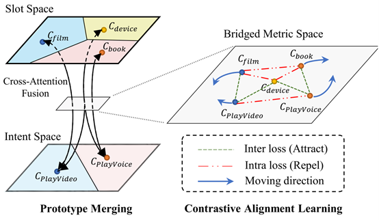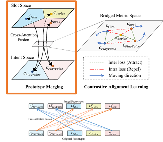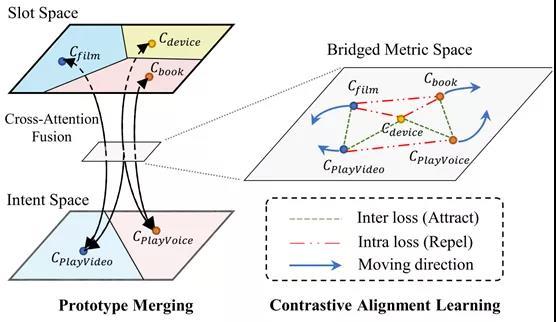 (2)解决方法:如图4左半所示,我们通过连接不同任务的类别表示来桥接不同任务的度量空间。这里我们连接意图类别和相关的槽位类别的表示。