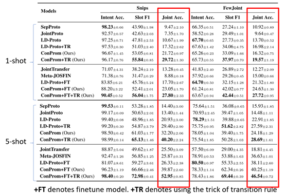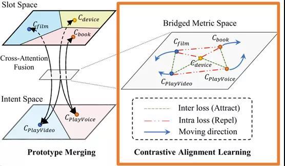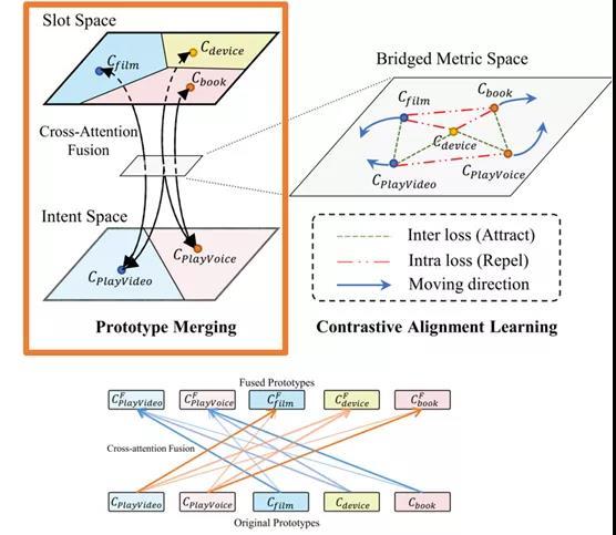 为了解决上述问题,我们提出了一种基于相似度的Few-shot学习方案,称为“ Contrastive Prototype Merging Network(ConProm 共舞)”。如图2所示,该模型在数据丰富的领域上学习如何动态地桥接不同任务(意图识别(intent recognition)和槽位填充(slot filling))的度量空间,然后在桥接后的度量空间上联合地优化两个任务。在两个公共数据集Snips和FewJoint上进行的实验表明,我们的模型在显著优于最强的基线模型(baseline)。两个数据集上1-样本设置(1 shot)结果上各提升约10个点。