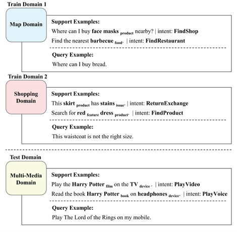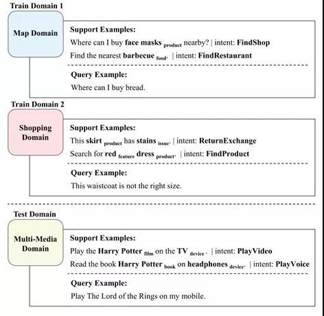 在本文中,我们以对话语言理解为切入点,研究了Few-shot情景下的联合学习(Joint-Learning)问题。现有的小样本模型往往每次只学习单一任务 [1,2]。然而,真实应用场景常常由多个彼此相关的任务组成 [3,4]。例如图1所示,对话语言的理解包含两个紧密相关的任务,即意图检测和槽位填充,并且常常受益于联合学习这两个任务 [5,6]。这种联合学习场景需要全新的小样本学习技术:从仅有的几个示例中捕获任务关系,并联合地学习多个任务。