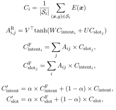 具体地,意图和槽位是否相关的关系是通过意图和槽类原型之间的交叉注意力来学习的(如图4 下所示)。然后,我们用插值的方式融合跨任务但相关的类别表示信息,从而在两个任务的原型之间自适应地共享信息,如下式所示: