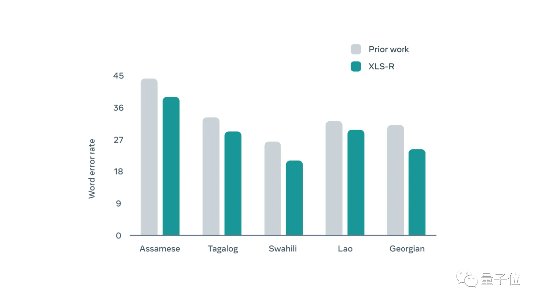 XLS-R共有20亿参数,它在测试的37种语言中,表现优于大多数语种先前的工作。甚至在老挝语等小语种识别上,也能低于之前的错误率。