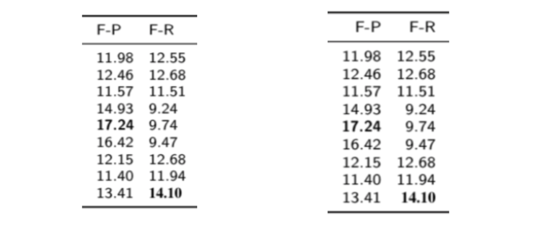 表格中的加粗请使用 \textbf{},而非\bf。上图右边中,14.10的加粗就错误地使用了\bf,导致对齐出现问题(这一问题仅在某些模板中存在),而17.24的加粗就使用了\textbf{}。