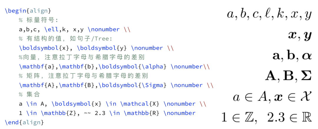 矩阵大写加粗。拉丁字母用\mathbf(e.g. ),希腊字母用\boldsymbol(e.g. )。 -