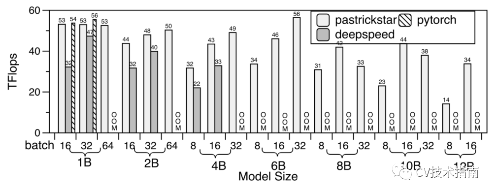PyTorch、DeepSpeed和PatrickStar在同一GPU上的训练吞吐量。OOM表示超内存。
