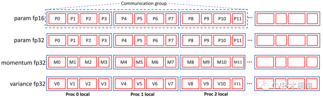 如图所示,通信组由块列表的nproc连续块组成,其中每个块属于不同的进程。根据前面的块张量映射模式,我们可以设计一种以最小的进程间通信量实现数据并行的通信方案。进程只需要在FWD和BWD阶段传送参数FP16和梯度FP16。需要最大量数据(包括动量、方差、参数FP32和梯度FP16)的ADAM阶段在本地执行。