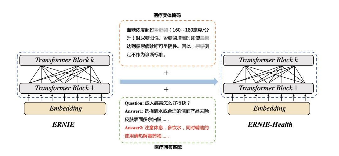 ERNIE-Health依托百度文心ERNIE先进的知识增强预训练语言模型打造,通过医疗知识增强技术进一步学习海量的医疗数据,精准地掌握了专业的医学知识。ERNIE-Health利用医疗实体掩码策略对专业术语等实体级知识学习,学会了海量的医疗实体知识。同时,通过医疗问答匹配任务学习病患病状描述与医生专业治疗方案的对应关系,获得了医疗实体知识之间的内在联系。