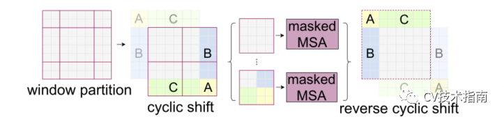 在这里,论文提出了更有效的批处理计算方法,即向左上角方向循环移动,如图所示。在这种转移之后,批处理窗口可能由特征图中不相邻的几个子窗口组成,因此采用mask机制将self-attention计算限制在每个子窗口内。在循环移位的情况下,批处理窗口的数量与常规窗口划分的数量相同,因此也是有效的。