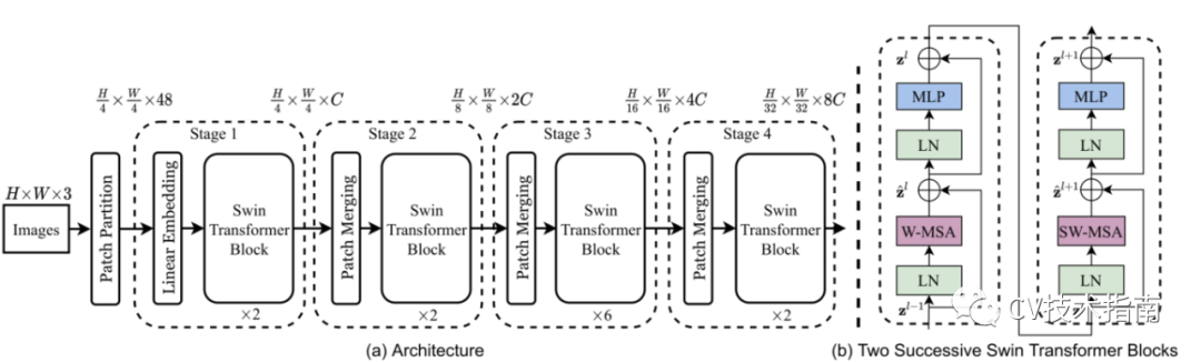 图3.(a)Swin Transformer(Swin-T)的架构;(b)两个连续的Swin Transformer块(用公式表示(3))。W-MSA和SW-MSA分别是具有规则和移位窗口配置的多头自注意模块。