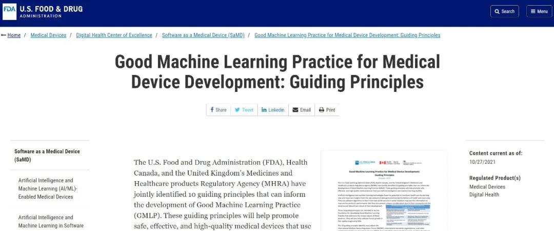 2021年10月27日,FDA、加拿大卫生部和英国药品和保健品管理局(MHRA)联合发布了10项指导原则,可以为机器学习规范(Good Machine Learning Practice, GMLP)的发展提供参考。这些指导原则将有助于促进安全、有效和高质量的使用人工智能和机器学习(AI/ML)的医疗设备的开发。