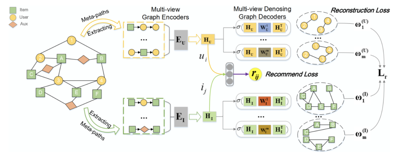 今天给大家介绍的是华南理工大学马千里教授课题组发表在KDD2021上的文章“Multi-view Denoising Graph Auto-Encoders on Heterogeneous Information Networks for Cold-start Recommendation”。这篇文章提出了一个多视图去噪图自编码器模型MvDGAE以处理冷启动推荐问题。首先通过提取异构信息网络上的多层面语义信息以增强不同方面的用户/项目关系。然后在训练过程中随机删除一些用户-项目交互视图,让解码器使用有限的视图来恢复整个视图。最后贝叶斯任务权重学习器用来自动平衡多视图图重构目标。最终在多个数据集上的大量实验结果表明MvDGAE显著优于最先进的推荐模型。