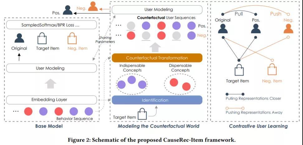 本文主要针对的是如何从用户历史行为序列中学习到更鲁棒更有效的表征。用户历史行为序列中是存在噪声的,并且序列本身是稀疏的,因此本文针对现存的问题,提出CauseRec方法通过对反事实数据分布进行建模,更多地信任不可或缺的行为从而提高鲁棒性。给定行为序列,CauseRec识别可有可无的概念和不可或缺的概念,CauseRec 通过替换原始序列中的可有可无和不可或缺的概念,有条件地从反事实数据分布中采样用户概念序列。