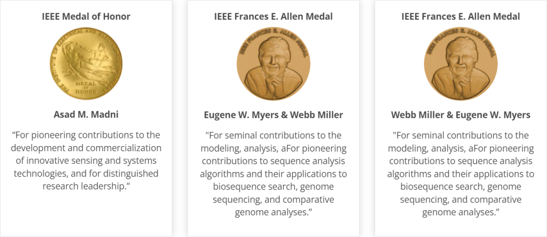 此外,Asad M. Madni 获得了今年的 IEEE 荣誉奖章,Deborah Estrin获得了IEEE 约翰·冯·诺依曼勋章(IEEE John von Neumann Medal),Eugene W. Myers 和 Webb Miller获得了首届IEEE Frances E. Allen 奖章。