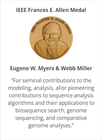 Eugene W. Myers 和 Webb Miller因在建模、分析、以及在序列分析算法方面的开创性贡献及其在生物序列搜索、基因组测序和比较基因组分析方面的应用,成为该奖项首届获奖者。