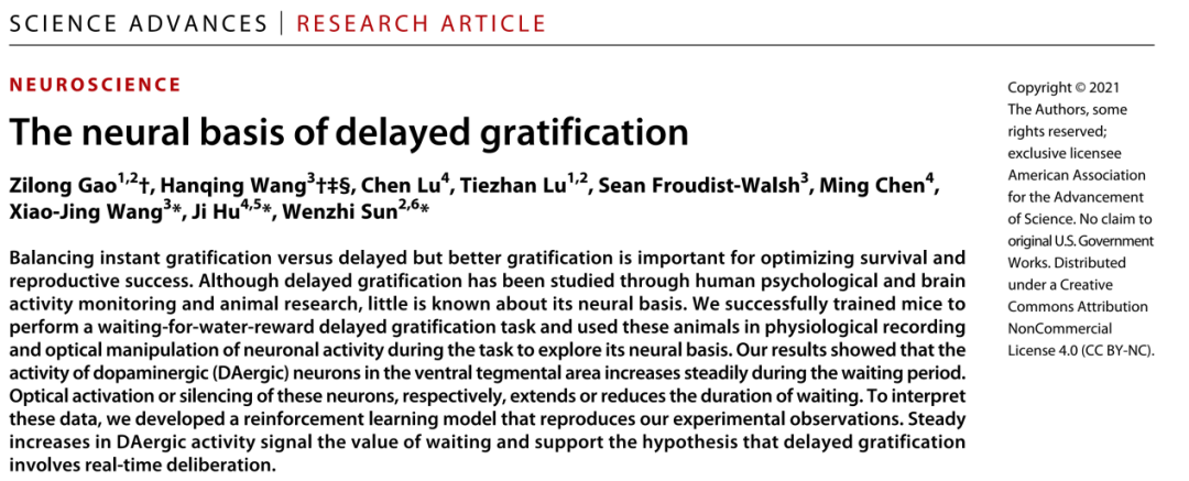 2021 年 12 月 1 日,北京脑科学与类脑研究中心孙文智团队,上海科技大学胡霁团队和纽约大学汪小京团队在国际期刊 Science Advances 在线发表题为「The neural basis of delayed gratification」的研究论文,揭示了 VTA 多巴胺能神经元在延迟满足这一心理过程中的神经基础,为提高自控能力和治疗注意力缺陷多动障碍提供了一定的思路。