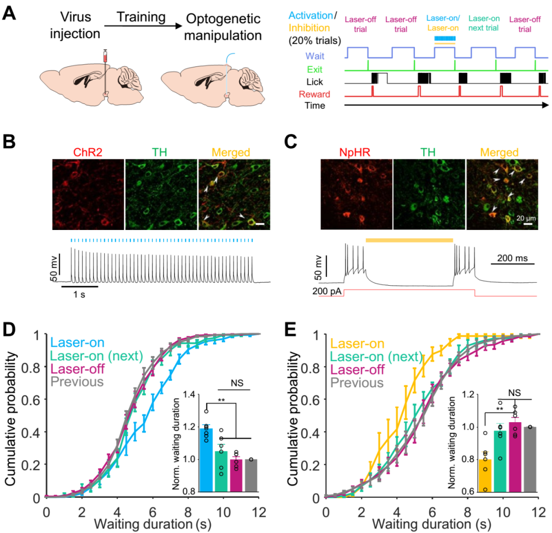 那么,改变 VTA 多巴胺能神经元的放电模式是否会影响小鼠的等待行为呢?为了验证这个问题,研究者在小鼠执行延迟满足任务的等待期间以 20% 的概率对 VTA 多巴胺能神经元的活动进行了光遗传操控,结果发现激活多巴胺能神经元只会使激活对应试验的小鼠等待时间显著延长,而抑制则会表现出相反的结果。