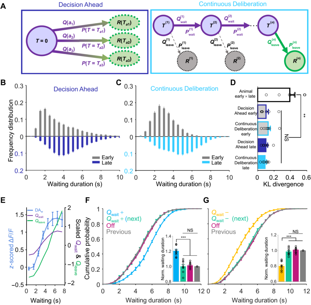 小鼠在延迟满足任务中的什么时候进行决策,以及等待过程中缓慢上升的多巴胺能神经活动到底编码了什么?为了回答以上的问题,研究者分别建立了两种强化学习模型:预先决定(decision ahead)和连续思考(continuous deliberation)来分别对动物行为实验、光纤记录实验以及光遗传实验的数据进行预测模拟,结果显示连续思考的强化学习模型模拟的结果与实验数据更加吻合,提示等待期间缓慢上升的多巴胺能活动编码了延迟满足等待的价值,并进一步揭示延迟满足的决策是一个实时思考的过程。