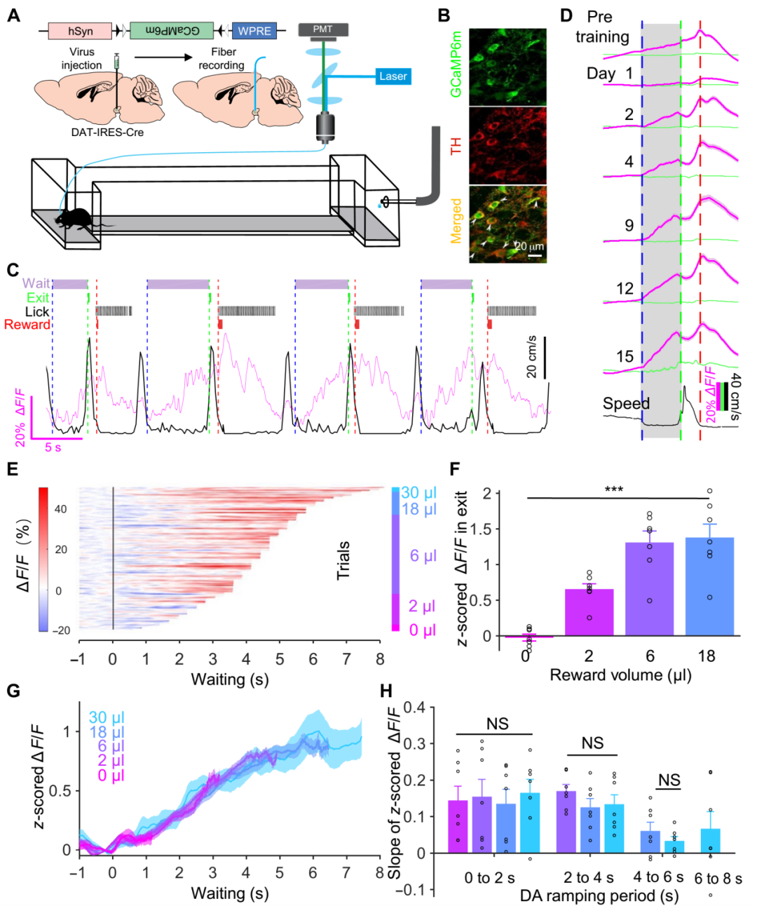 图 1:光纤记录与 VTA 多巴胺能神经元在小鼠等待期间的钙活动变化。