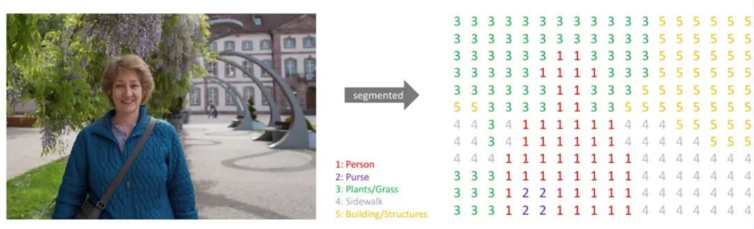 如下面这种图,标注类别包括:Person、Purse、Plants、Sidewalk、Building。将语义标签图转换为单通道掩膜后为右图所示,尺寸大小不变,但通道数由3变为1。