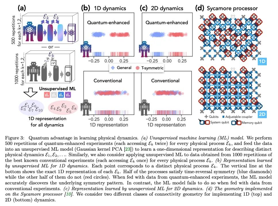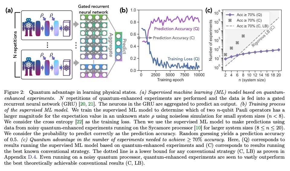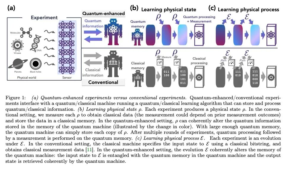 实验学习的量子优势。量子技术有可能彻底改变获取和处理实验数据以了解物理世界的方式。一个将数据从物理系统迁移到稳定的量子存储器,并使用量子计算机处理这些数据的实验装置,可以比传统的实验具有显著的优势,在传统实验中,物理系统被测量,结果用经典计算机处理。本文证明,在各种任务中,量子机可以从比传统实验所需的实验数量少得多的实验中学习。在预测物理系统属性、对噪声状态进行量子主成分分析以及学习物理动力学近似模型方面,指数级优势是成立的。在某些任务中,实现指数级优势所需的量子处理可以是适度的;例如,只需处理系统的两个副本,就可以同时了解许多非交换的观测变量。通过对多达40个超导量子比特和1300个量子门进行实验,证明了使用今天相对含噪的量子处理器可以实现巨大的量子优势。结果强调了量子技术如何能够实现强大的新策略来学习自然。