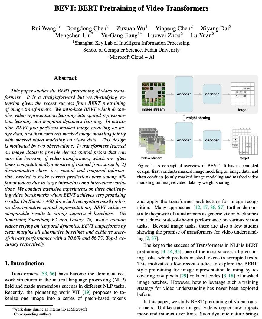 [CV] BEVT: BERT Pretraining of Video Transformers