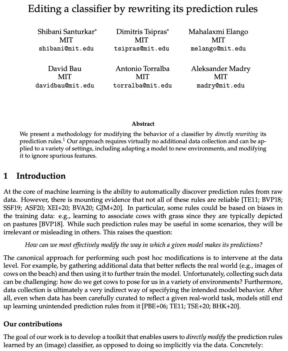 基于预测规改写的分类器编辑。本文提出一种通过直接改写预测规则来修改分类器行为的方法,用于对视觉分类器进行有针对性的事后修改。该方法使用户在模型调试过程中更容易编码先验知识和偏好,从根本上改变了模型处理一个给定概念的方式——因此有可能在用于编辑的特定类别之外编辑其行为。该方法几乎不需要额外的数据收集,可应用于各种环境,包括使模型自适应于新环境,以及修改它以忽略虚假特征。