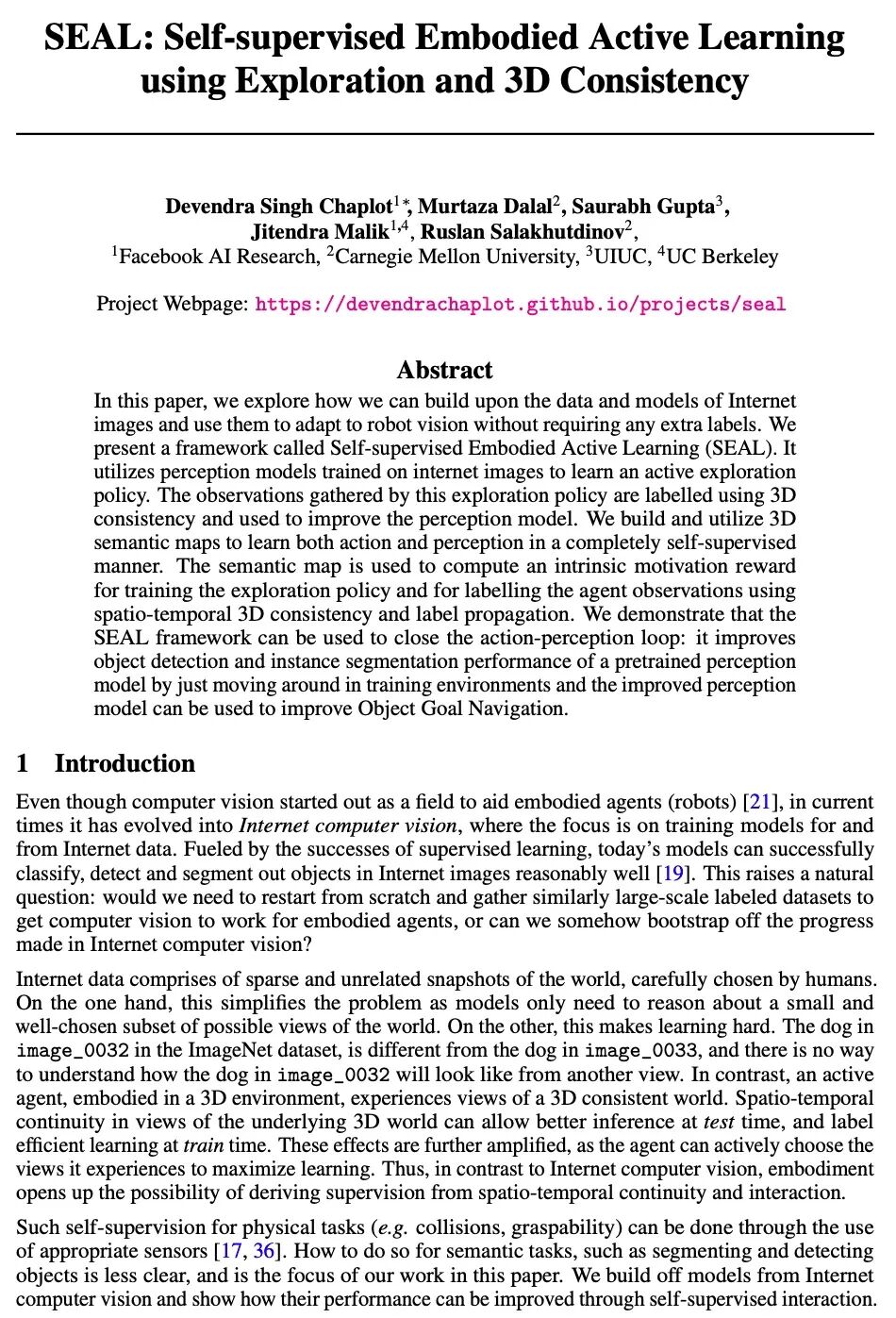 3、[CV] SEAL: Self-supervised Embodied Active Learning using Exploration and 3D Consistency