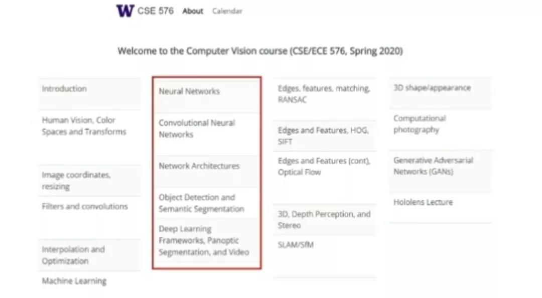 实际上,在华盛顿大学「计算机视觉」的课程安排中,老师们会首先介绍经典的信号处理算法,接着介绍神经网络和深度学习。在此基础上,老师们会进而讲解一些经典的技术和应用(例如,3D 计算摄影、神经渲染等)。