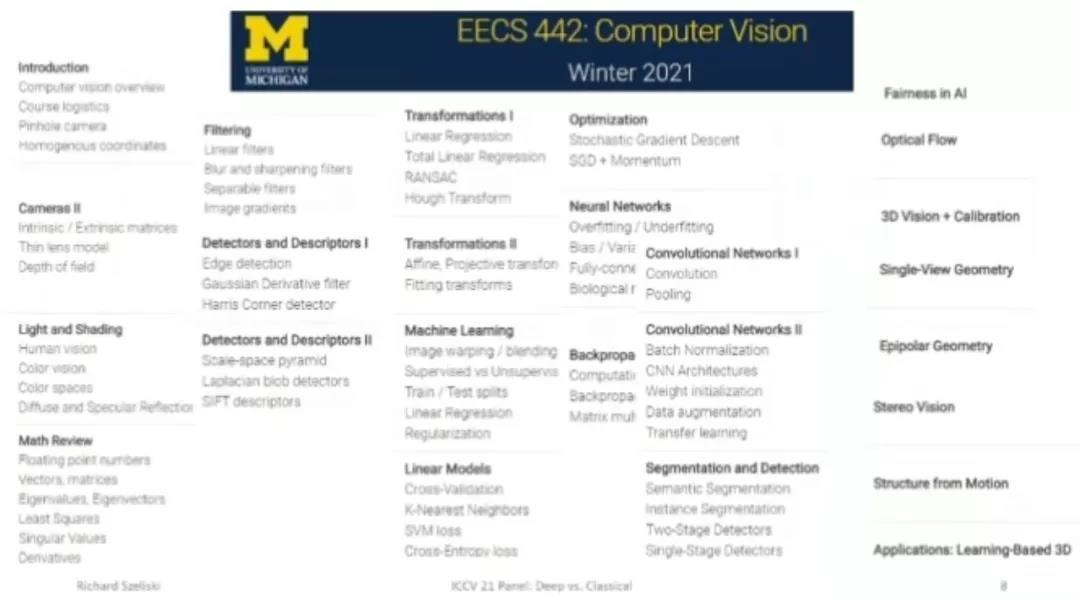 密歇根大学的计算机视觉课程 EECS 442 将期中的很大一部分内容设置为深度学习相关的内容,但在此之前也会介绍经典的信号处理、特征提取技术。最后,教师会讲解 3D 视觉和经典计算机视觉的内容。此外,这门课的任课教师 Justin Johnson 还专门针对神经网络开设了一门课程,更为详细地介绍了循环神经网络、Transformer 等内容。