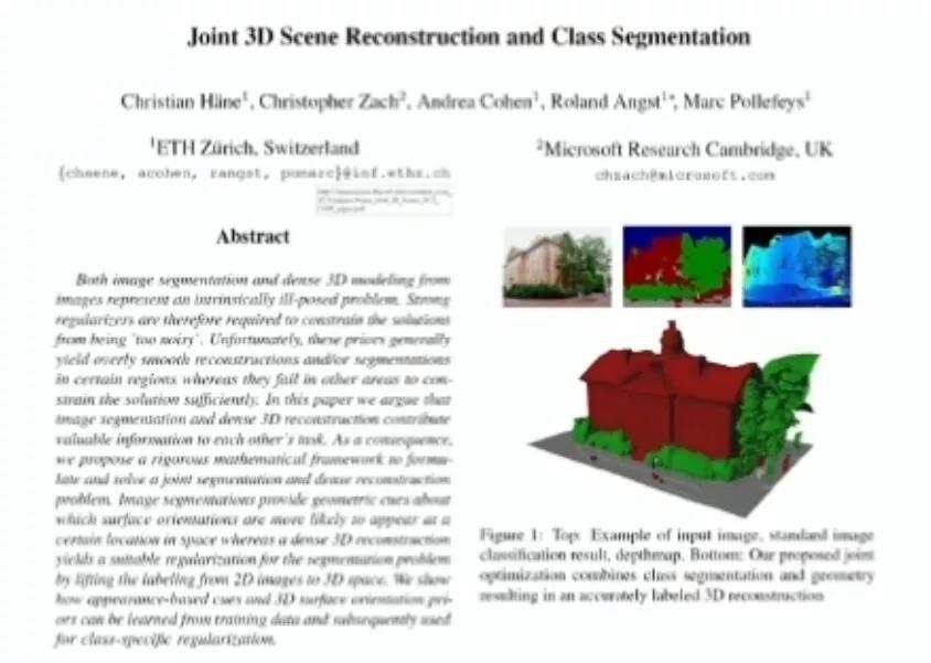 另一方面,利用语义信息完成 3D 重建等任务也是一条很好的思路。论文「Joint 3D Scene Reconstruction and Class Segmentation」发表于 2013 年,那时是深度学习兴起的早期阶段。通过识别建筑和树的部位,该方法可以更好地进行 3D 重建,这说明有时引入语义信息是十分有效的。