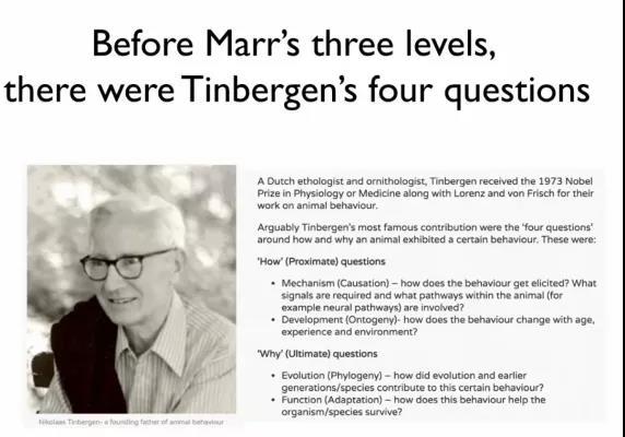 David Marr 最重要的观点是将视觉作为一种科学来思考。上世纪 70 年代末期,他指出我们应该从三个层次理解计算机视觉任务:(1)计算理论:底层的物理约束(2)算法(3)硬件上的算法实现。实际上,早在上世纪 50、60 年代,1973 年的诺贝尔生理和医学奖得主、生物学家廷伯根就做了一系列工作,有助于我们在如今思考基于学习的计算机视觉和传统方法之间的关系。