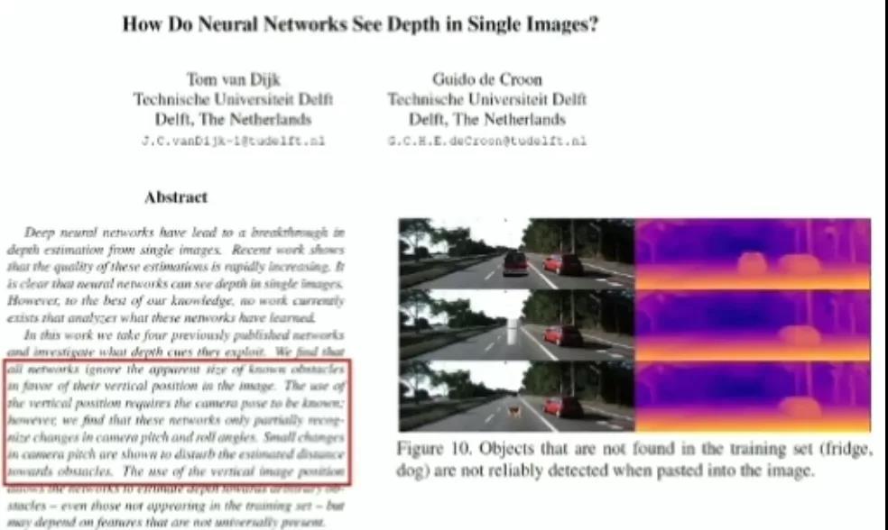 在单目深度估计任务中,我们往往在 KITTI 数据集或一些驾驶场景中进行训练和测试。大多数的神经网络模型只是识别物体在图像中的位置,然后为其赋予一个相应的深度。如果我们将一个网络没见过的物体(例如,冰箱或狗)放在路的中间,神经网络可能会完全忽略掉该物体。在驾驶场景下使用这种神经网络模型的安全性值得商榷。