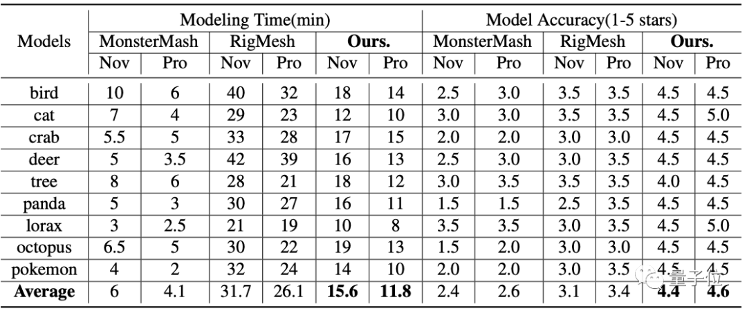 研究者还请来了12位经验各异的用户来使用MonsterMash2、RigMesh3,以及本文提出的系统来创建3D模型。