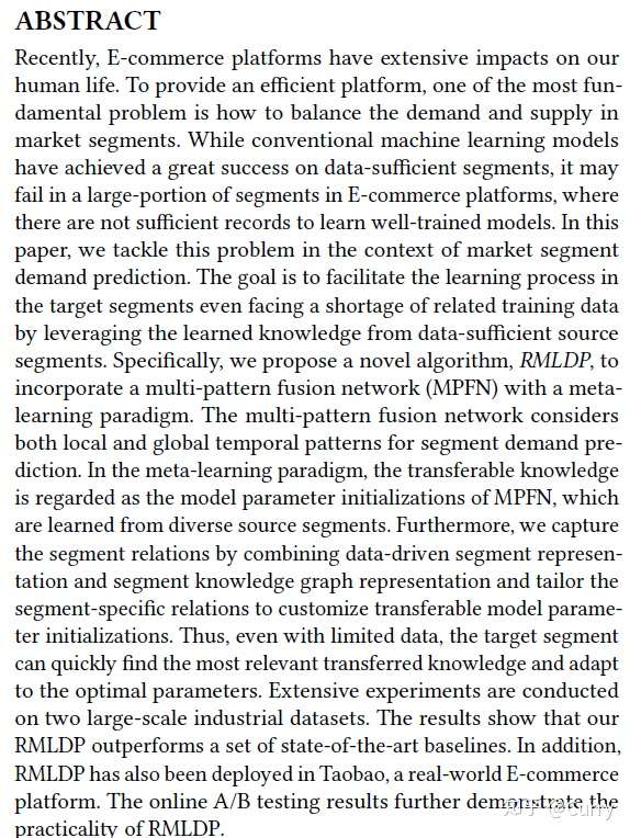 - 开发了一个新的框架RMLDP,以解决细分市场的需求预测任务。RMLDP结合了一个具有元学习范式的多模式融合网络。在元学习范式中,进一步提取片段关系以定制模型参数初始化。并将所提出的方法应用于在线平台。