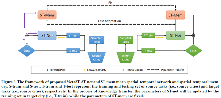 - 提出了一个新的MetaST框架,通过将时空网络与元学习范式相结合来解决问题。此外,从所有的源城市学习一个全局内存加密的长期时空模式,并将其传输到目标城市,以进一步提高目标城市的时空预测能力。