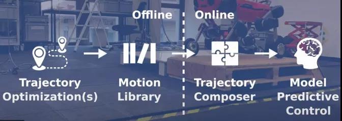 从官方视频来看,Swiss-Mile 机器人用到了轨迹优化技术:将高级任务转化为动态可行的运动,这些运动存储在机器人的运动库中,来自该库的单个运动进行组合并反馈至 MPC: