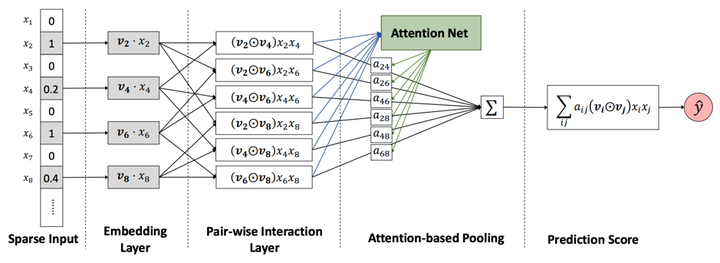 除了带注意力机制的交叉部分外,依然保留了线性部分。还可以看出,相对于NFM,AFM没有后面的DNN部分。不过从各种组合模型相对丰富的今天来看,读者完全可以根据自己的数据特点做模型的扩展和修改。