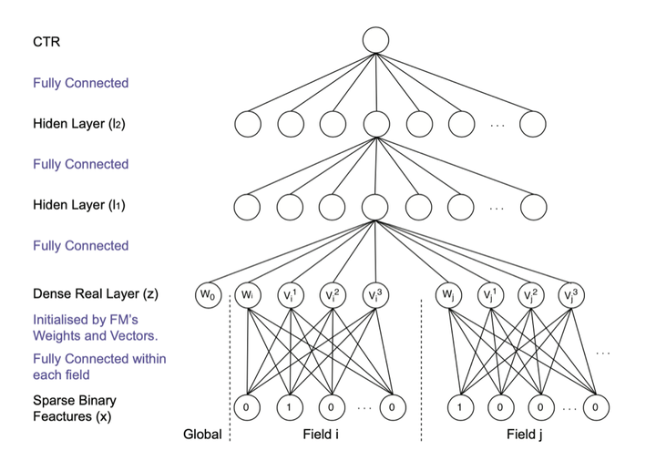 模型的核心思想是采用FM训练得到的隐向量作为神经网络第一层权重的初始值,之后是隐藏层,最后是点击率预估的输出。其实是一个Embedding + MLP结构,特殊的是Embedding的初始值是FM模型已经预训练好的结果。FM与Embedding的初始化对应关系如图3所示。