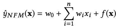 FNN探索了FM与DNN相结合的方式,而Wide&Deep则给出了一种模型组合的思路,NFM通过设计一种结构,把FM和DNN直接组合了起来,不同于FNN需要两阶段训练,NFM是一个同时包含了FM和DNN两部分的完整模型,训练过程是端到端的。我们先来看一下NFM的公式: