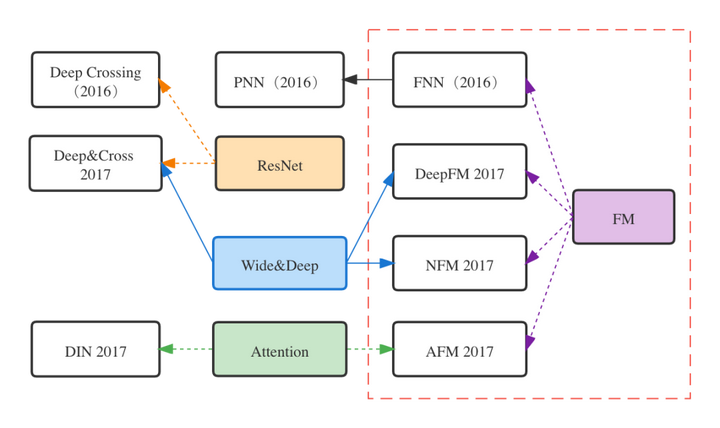 FM模型作为推荐系统领域的一个独立创新,不仅是浅层学习时代的主流模型,而且对深度学习时代的模型演化也产生了深刻的影响。本章将介绍几个经典的FM家族模型,并从内部演化的角度来探讨它们之间的联系与区别,这几个模型如图1中的虚线框所示。