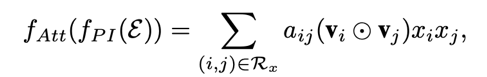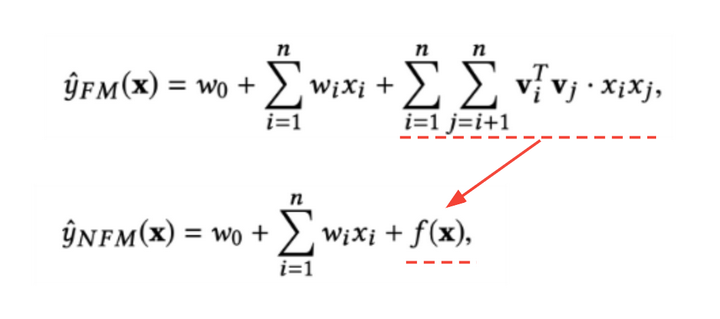 可以看出,与FM的公式相比,前两项是一样的,只有第三项由原来的二阶隐向量内积变成了f(x)。