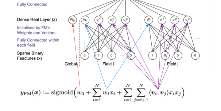 首先,我们先简要回顾一下FM模型(更详细的介绍请见之前的文章:再看FM模型)。FM是因子分解机(Factorization Machines,2010)的简称,实现了特征的两两自动交叉,通过特征隐向量的内积来学习交叉特征的权重。公式表示为: