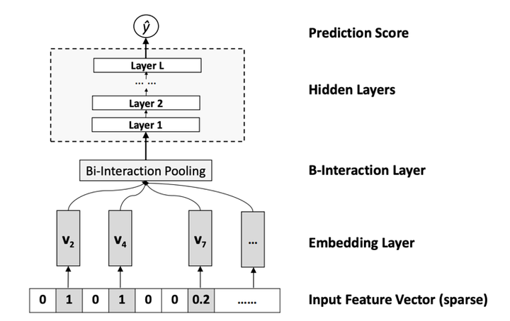 其核心是Bi-Interaction Pooling部分,它的作用是实现输入向量的两两相乘,然后累加起来,再送入DNN做进一步的交叉。
