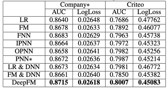 论文中,DeepFM与其他一些模型的效果做了对比,优势还是挺明显的。如下表: