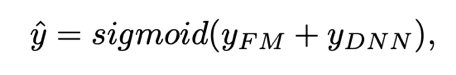 模型的左侧是FM部分,其中又包含了一阶特征和二阶交叉特征;右侧是一个DNN网络,左右两边共享Embedding输入;输出层是两侧输出之和,公式如下: