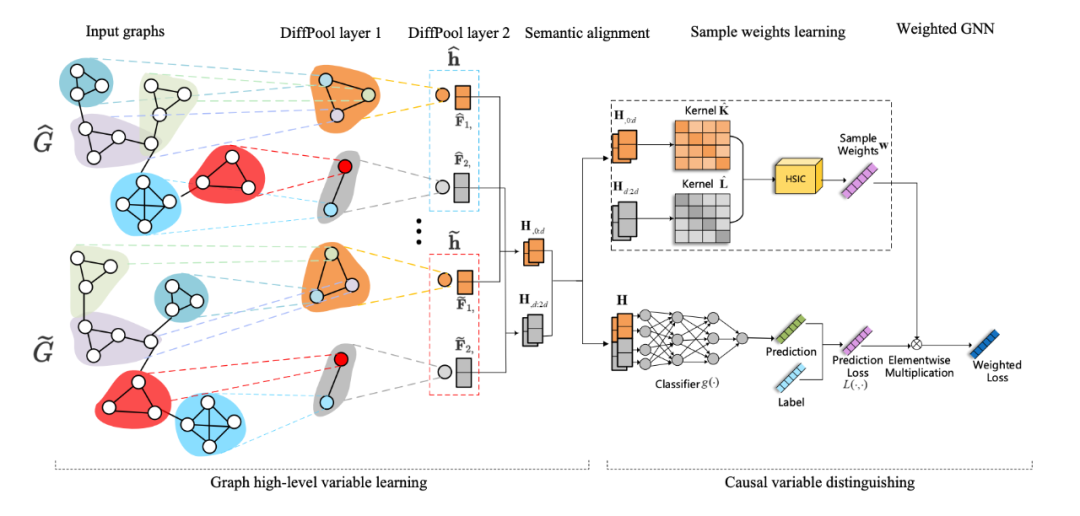 所提出框架的基本想法是设计一个因果表示学习方法来抽取有意义的图高层语义变量然后估计他们对于图级别任务的真实因果效应。如下图 2所示,所提出的模型框架主要分为两个部分:图高层语义表示学习模块和因果变量区分模块。