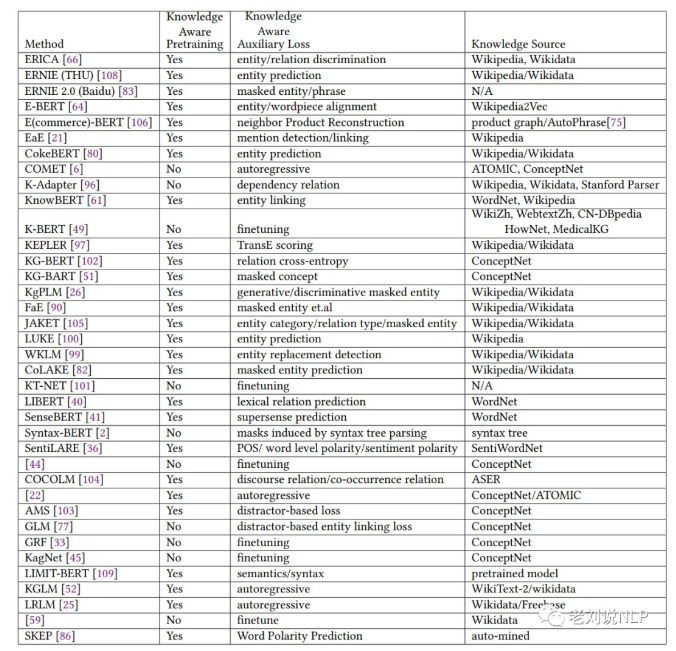 因此,如何将单一输入文本的其他类型的知识信息融入到模型当中,成为了现在提升模型性能的一个重要方向,并且已经被证明可以提升模型结果。如下图列举了一些现有知识图谱融合的预训练模型放大、知识相关的损失loss,以及所使用的知识来源。